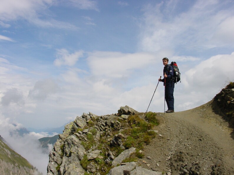 Noch von der Tour du Mont-Blanc im August 2001 kennen wir den ausgesprochen hässlichen Anstieg von Le Tour zum Col de Balme (damals Abstieg). Dieser Hang ist durch die Skilifte völlig entstellt und bietet einen ziemlich ernüchternden Einstieg in die atemberaubende Landschaft, die uns da in den nächsten Tagen erwartet. Daher (und da es bereits 13 Uhr ist als wir in Montroc loslaufen) nehmen wir die Gondelbahn und den Sessellift bis kurz unter den Col de Balme. Leider ist der Himmel wolkenverhangen, so dass wir den Mont-Blanc nicht wirklich gut erkennen können. Doch überraschenderweise werden wir später auf der Tour noch einmal einen Blick erhaschen können.