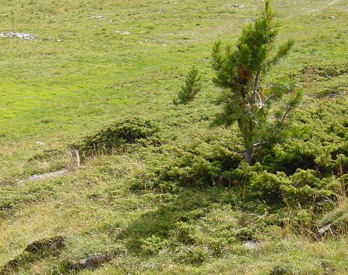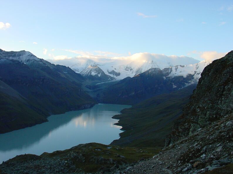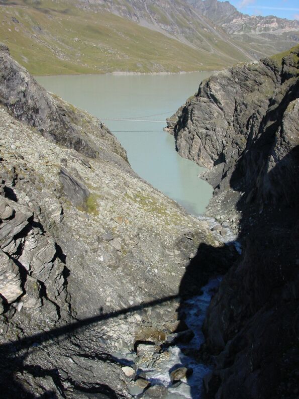 Vom Col steigen wir hinab zum Lac des Dix. Dabei verlassen wir den durch Schilder ausgewiesenen Weg unmittelbar vor der Refuge de la Barma, genau wie es der Wanderführer vorschlägt. Dies ist jedoch ein Umweg. Am lang gezogenen Seeufer entlang wandern wir Richtung Süden und können eine Reihe von Murmeltieren beobachten. Am Ende des Sees ist die untere Brücke über den Gletscherfluss des Glacier des Dix gesperrt. Aber es gibt ja noch eine...