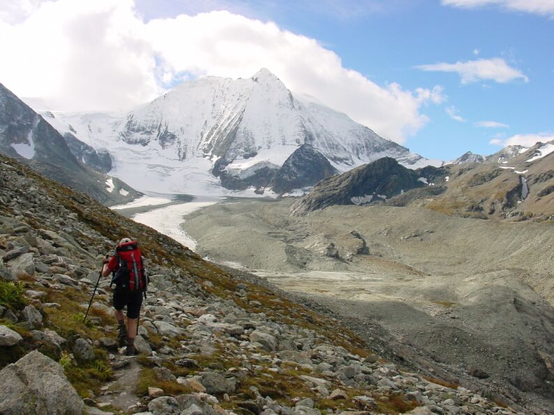 Der weitere Abstieg nach Arolla ist lang aber er verläuft durch ein wunderschön grünes Tal mit tollen Ausblicken auf schneebedeckte Berge.