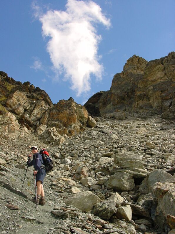 Wir wählen nicht den Weg über die Eisenleitern, sondern denken uns, nur die Harten kommen in den Garten und kraxeln die Wand zum Col de Riedmatten hoch. Der Weg ist wie beschrieben sehr steil und geröllig, aber nicht allzu gefährlich. Der Blick vom Col de Riedmatten zurück ist dann doch etwas Furcht einflößend.