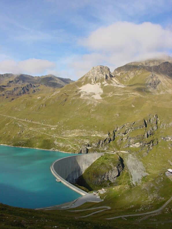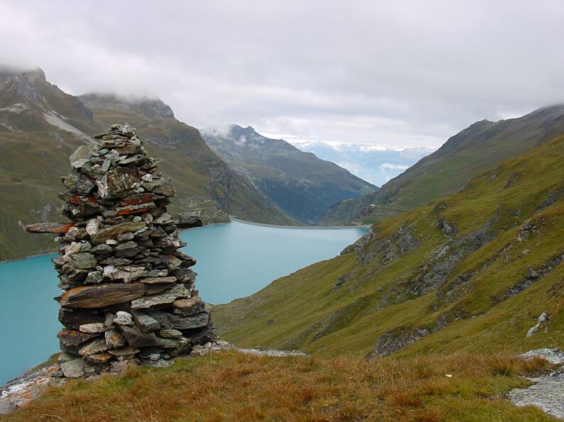 Über Nacht hat es geschneit, sowohl die Wasserleitungen als auch der Abstieg von der Cabane sind vereist. Wir starten trotzdem sehr früh und werden und werden von Nebel (macht den Abstieg nicht leichter...) und einer dichten Wolkendecke in Empfang genommen. Es ist sehr kalt. Auf dem schönen Höhenweg oberhalb des Lac de Moiry, der tiefblau im "Tal" liegt (Teil der "Tour du Lac 2500"), kommen wir gut voran und beginnen mit der durchkommenden Sonne langsam aufzutauen. Wir sind müde und wollen möglichst schnell nach Zinal. Daher entscheiden wir uns für die vermeintliche Abkürzung Postbus "Barrage de Moiry-Grimentz-Zinal" und steigen am Ende des Lac de Moiry ab zur Barrage anstatt zum Col de Sorebois aufzusteigen.