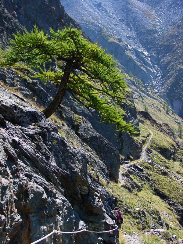 Wir entscheiden uns, am letzten Tag nichts mehr zu riskieren und umgehen die kurze aber angeblich super gefährliche Passage beim Erdrutsch 10 min hinter der Europahütte. Leider verlaufen wir uns beim Abstieg aber erheblich, so dass wir fast in Randa landen und dann mühsam durch unwegsames Gelände wieder aufsteigen müssen zum Europaweg.